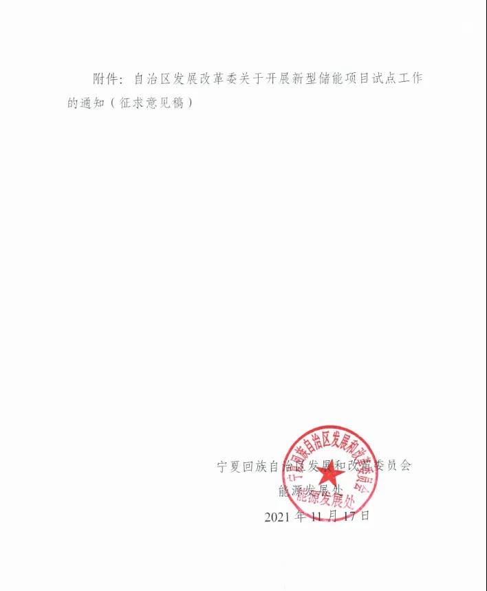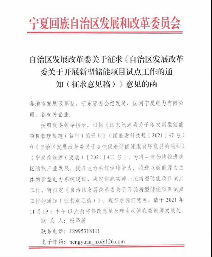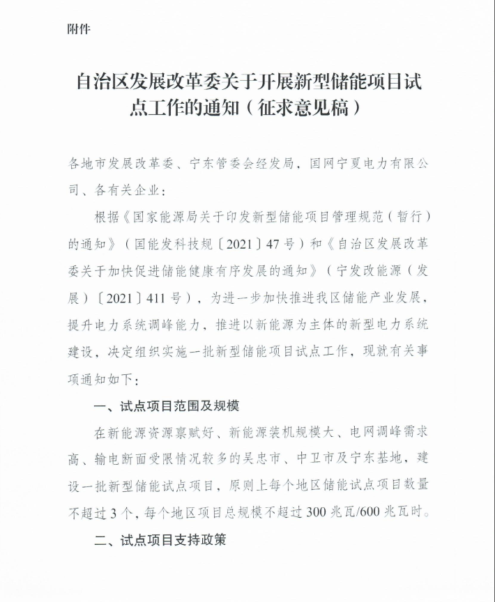 11月17日,寧夏回族自治區(qū)發(fā)展和改革委員會(huì)發(fā)布《關(guān)于開展新型儲(chǔ)能項(xiàng)目試點(diǎn)工作的通知(征求意見稿)》,根據(jù)意見稿,在新能源資源稟賦好、新能源裝機(jī)規(guī)模大、電網(wǎng)調(diào)峰需求高、輸電斷面受限情況較多的吳忠市、中衛(wèi)市及寧東基地,建設(shè)一批新型儲(chǔ)能試點(diǎn)項(xiàng)目,原則上每個(gè)地區(qū)儲(chǔ)能試點(diǎn)項(xiàng)目數(shù)量不超過3個(gè),每個(gè)地區(qū)項(xiàng)目總規(guī)模不超過300兆瓦/600兆瓦時(shí)。