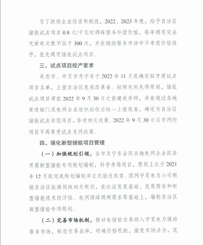 寧夏發(fā)改委:給予新型儲(chǔ)能試點(diǎn)項(xiàng)目0.8元/kWh調(diào)峰補(bǔ)償,每年調(diào)用不低于300次