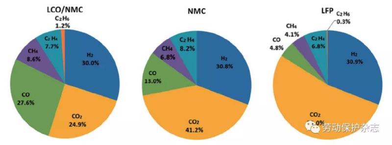 電池?zé)崾Э禺a(chǎn)生的一些氣體除了具有可燃性之外,還具有危害很高的毒性,如CO、HF(氟化氫)等。不同體系的電池在熱失控時(shí)產(chǎn)生的氣體成分及占比如圖2所示。