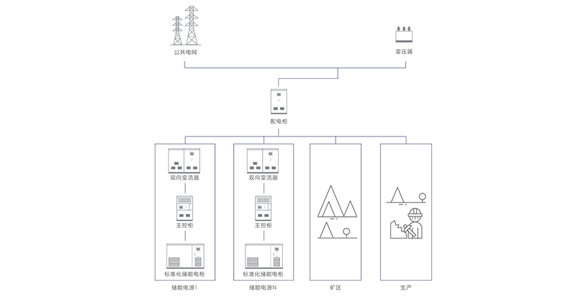 根據(jù)礦企的用電特性區(qū)分負(fù)荷種類,對重要負(fù)荷進(jìn)行配電改造,提供磷酸鐵鋰儲能系統(tǒng)”保安電源解決方案,實(shí)現(xiàn)大功率高倍率放電,在突然斷電等應(yīng)急場合安全使用,確保重要負(fù)荷的正常工作。